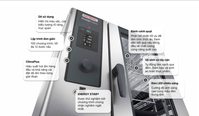 - Lò Nướng Rational iCombi Classic 6 Khay GN2/1 là một thiết bị không thể thiếu trong nhà bếp của các nhà hàng, khách sạn, và cơ sở chế biến thực phẩm lớn. Sản phẩm này không chỉ đáp ứng nhu cầu nấu nướng mà còn thực sự mang đến sự tiện lợi và đa dạng trong chế biến món ăn.
